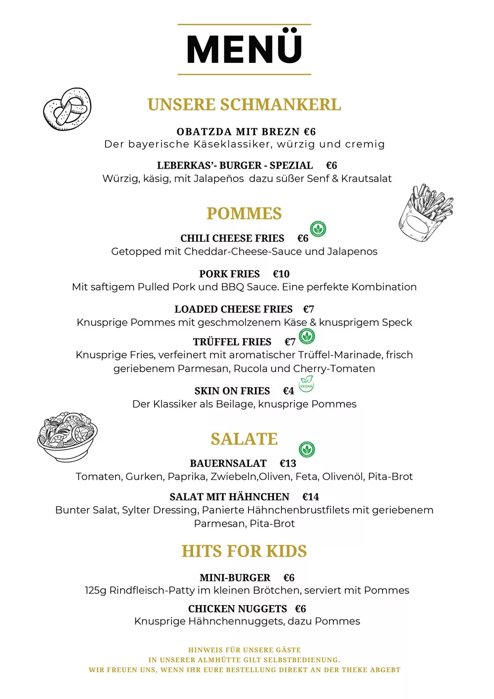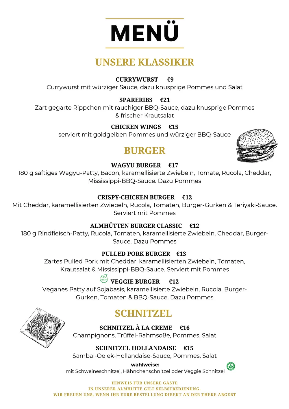 Für euer leibliches Wohl sorgt unser ALMHÜTTEN MENU mit Burgern, Salaten, Spareribs oder Schnitzeln – und dazu gibt`s auch noch wechselnde FOOD-Highlights!