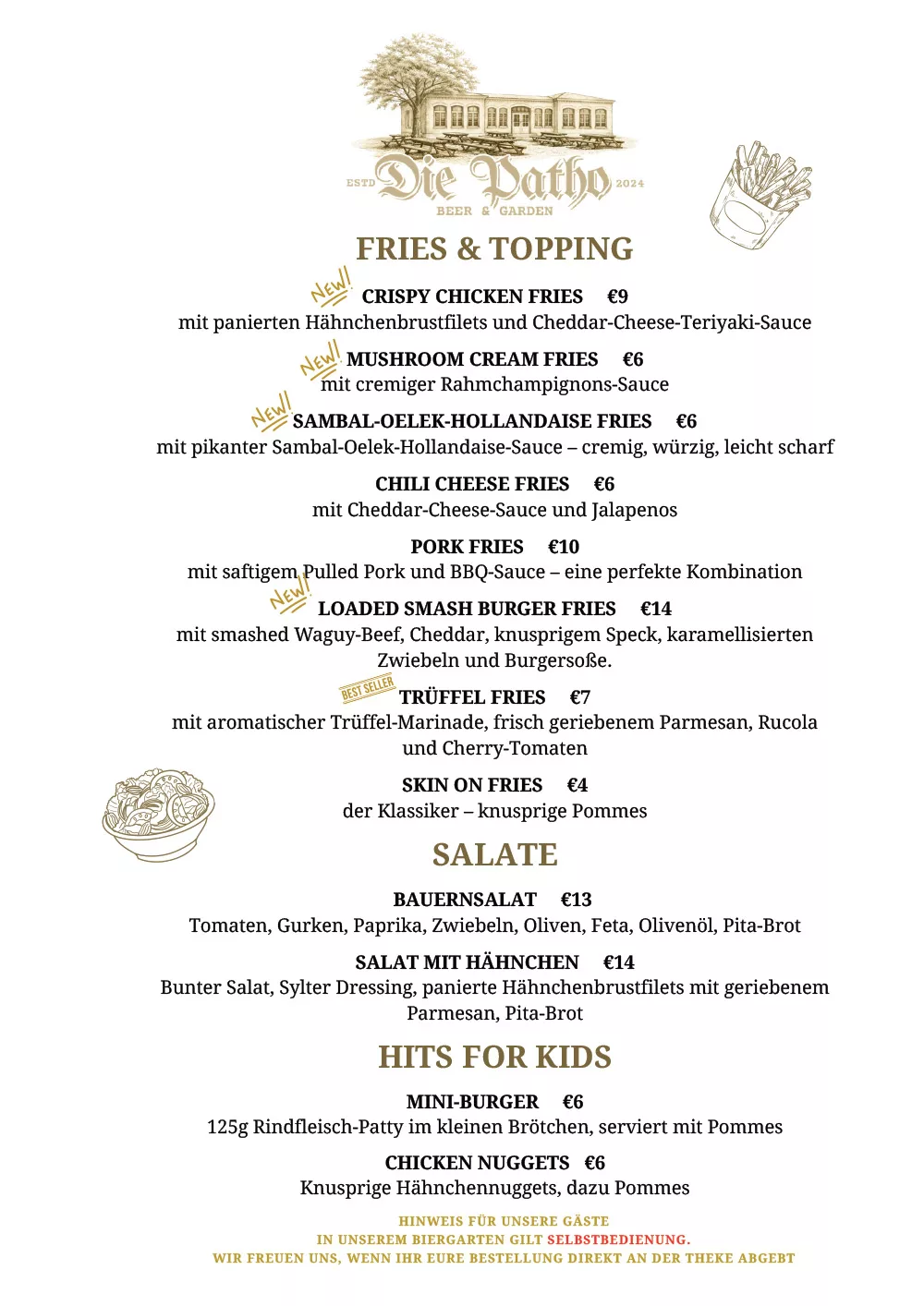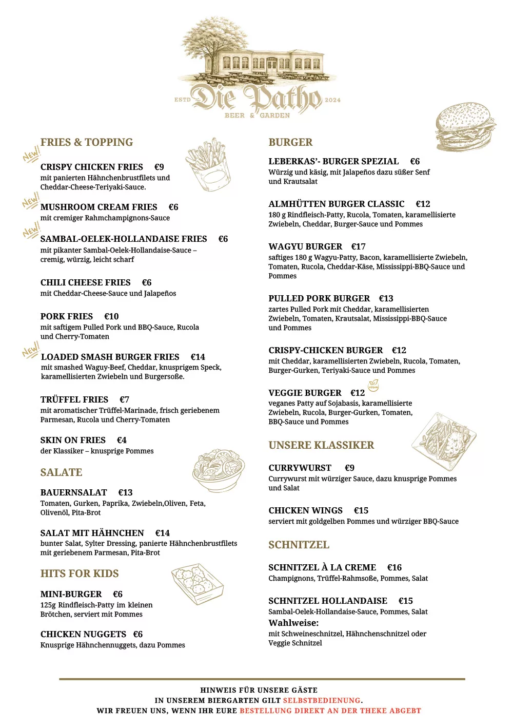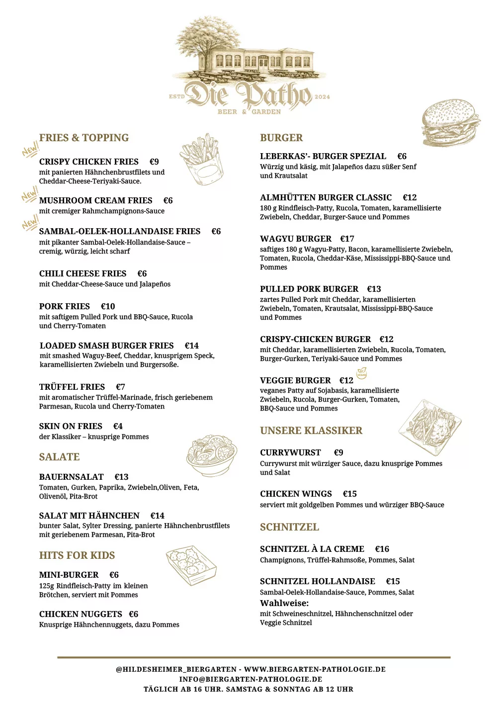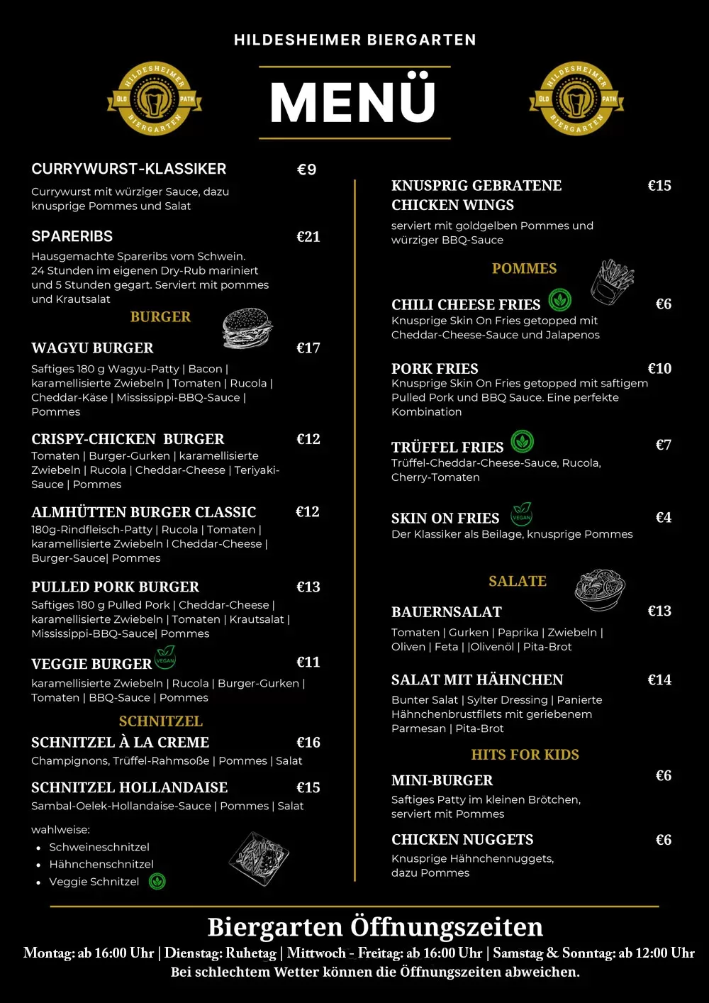 Gegen den großen und kleinen Hunger ist unsere Speisekarte das beste Mittel! Jedes Gericht für euch frisch zubereitet. Immer! Mitten im Grünen. Mitten bei uns in Hildesheim. Kommt vorbei!